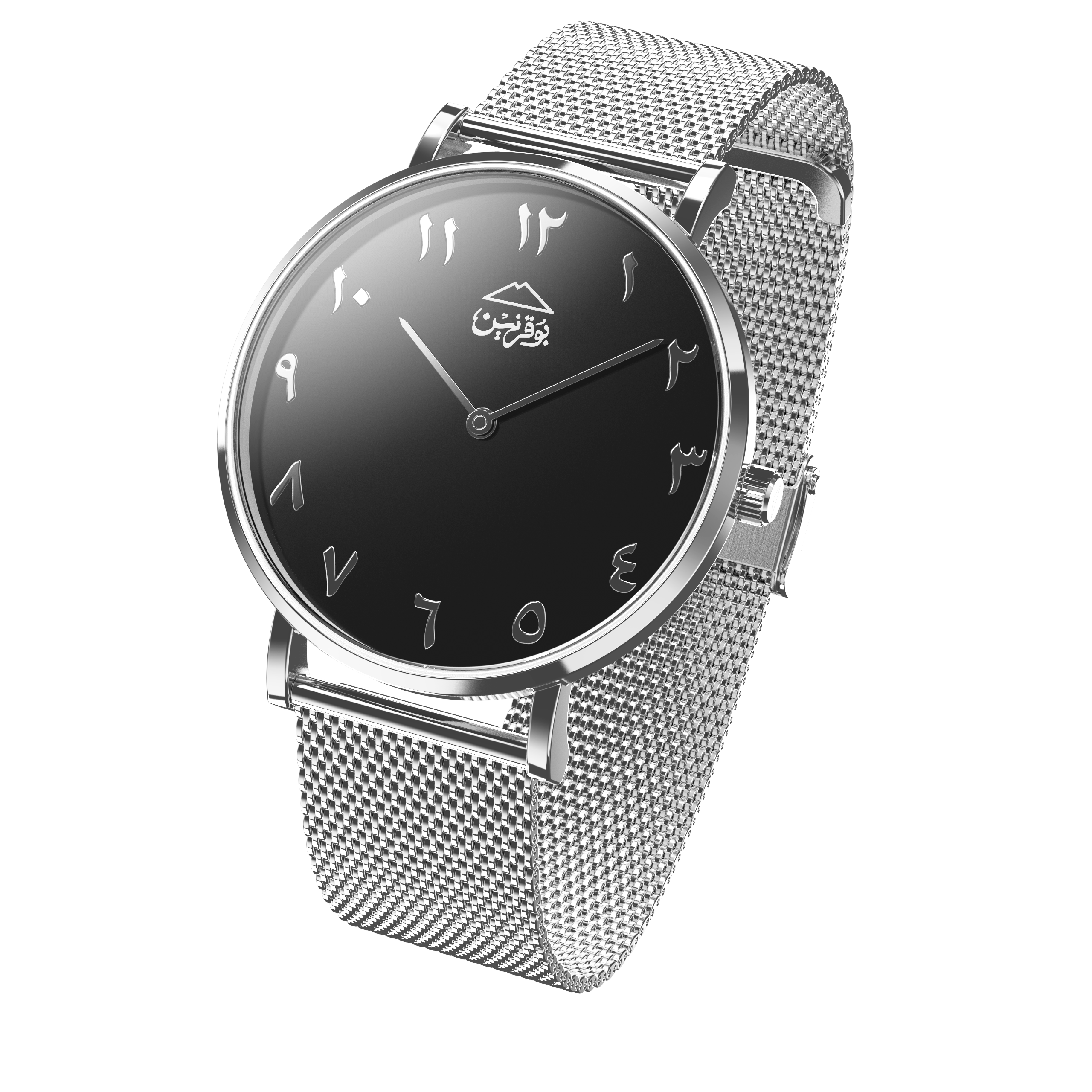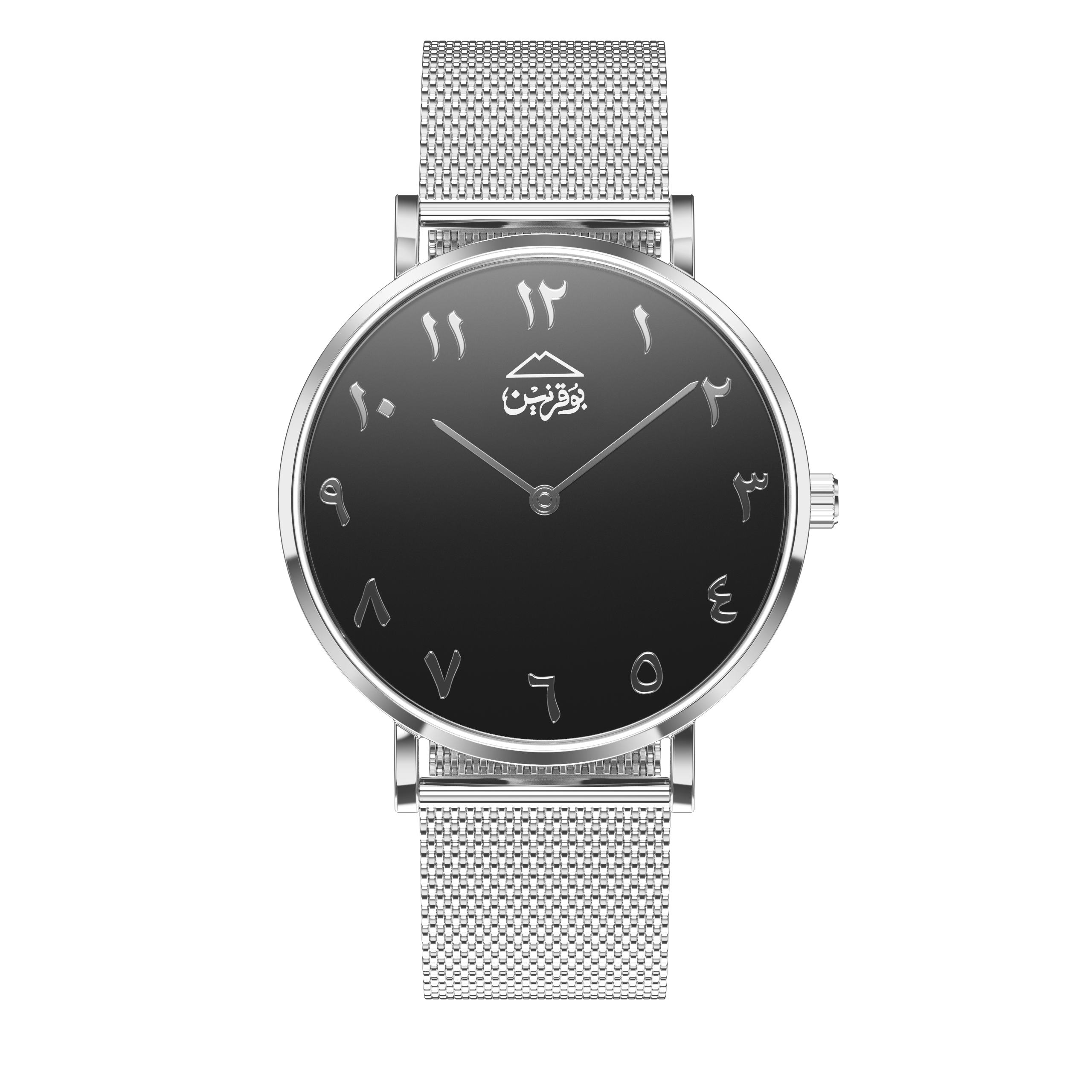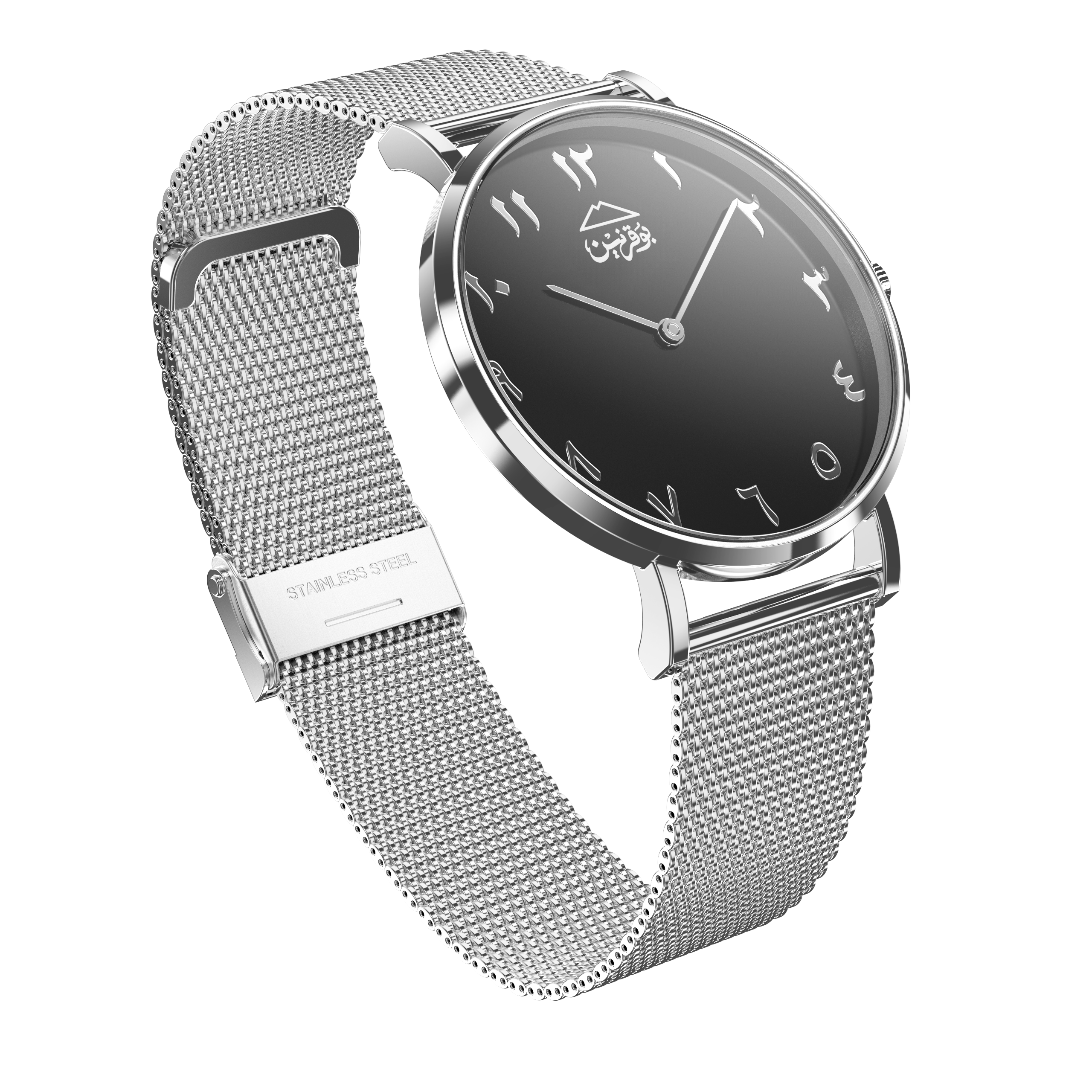 • Cadran avec Calligraphie Arabe : Un cadran noir distinctif orné de chiffres indiens et d'un logo en calligraphie arabe, ajoutant une touche de sophistication et de style unique, symbolisant la fusion culturelle et l'héritage artisanal.