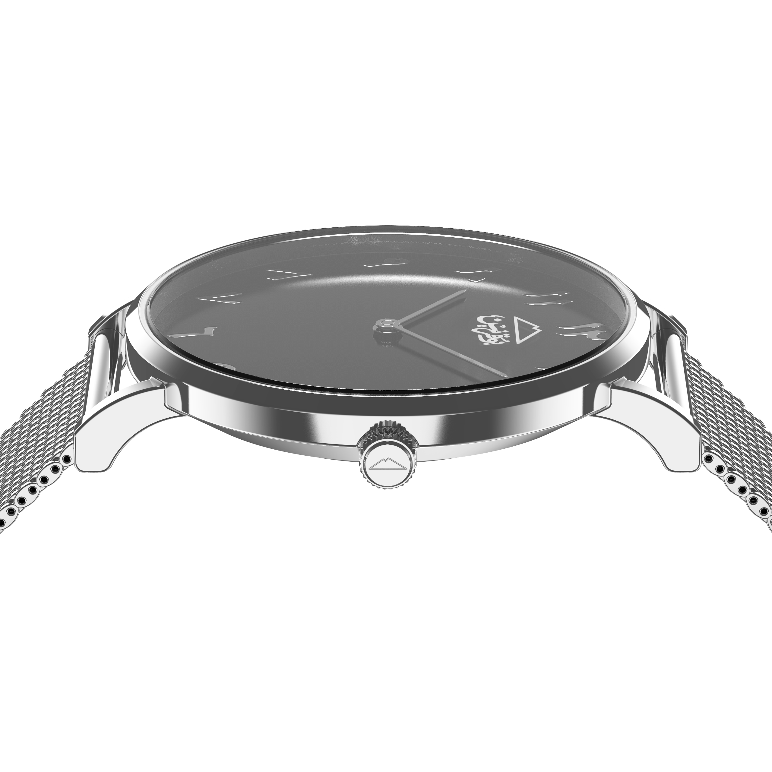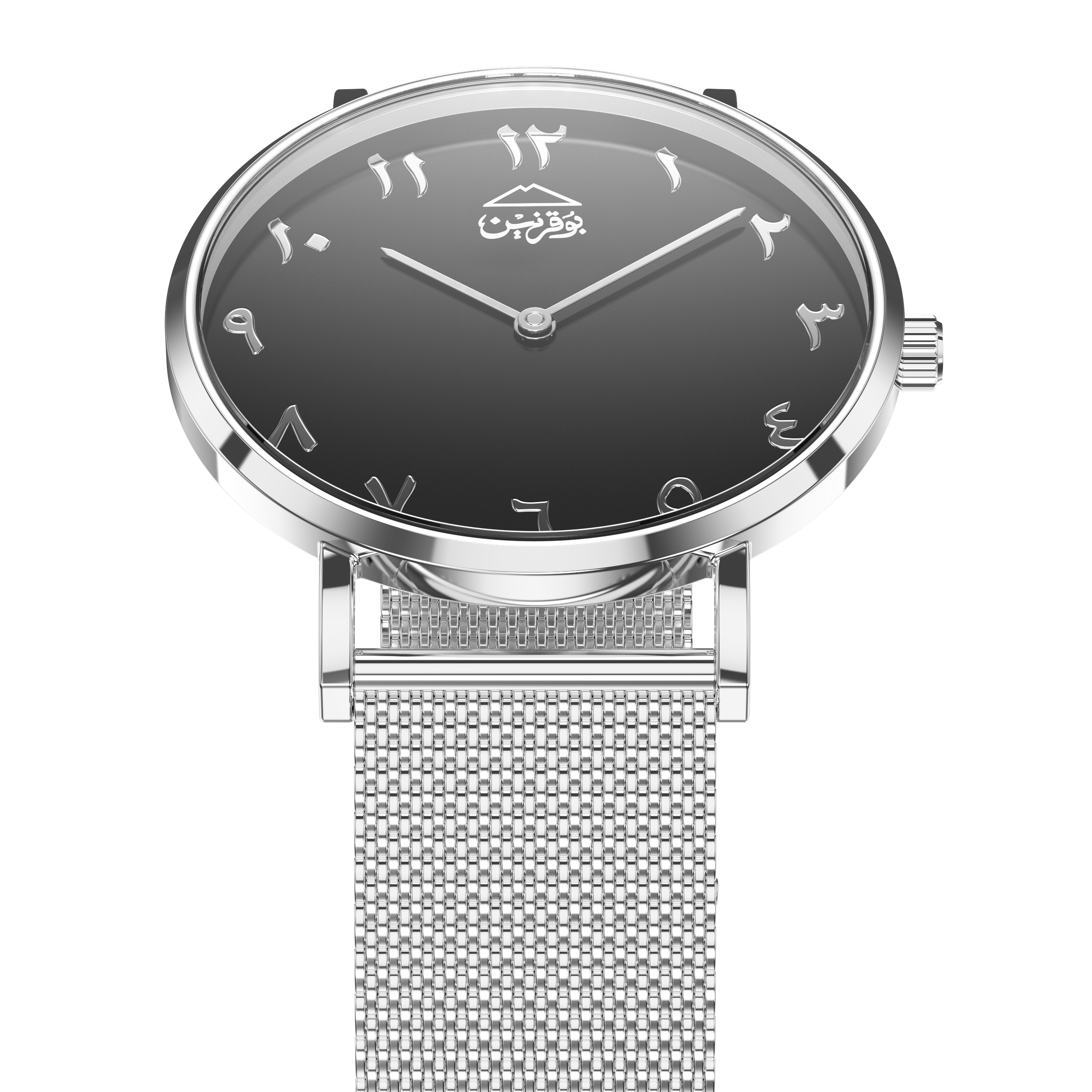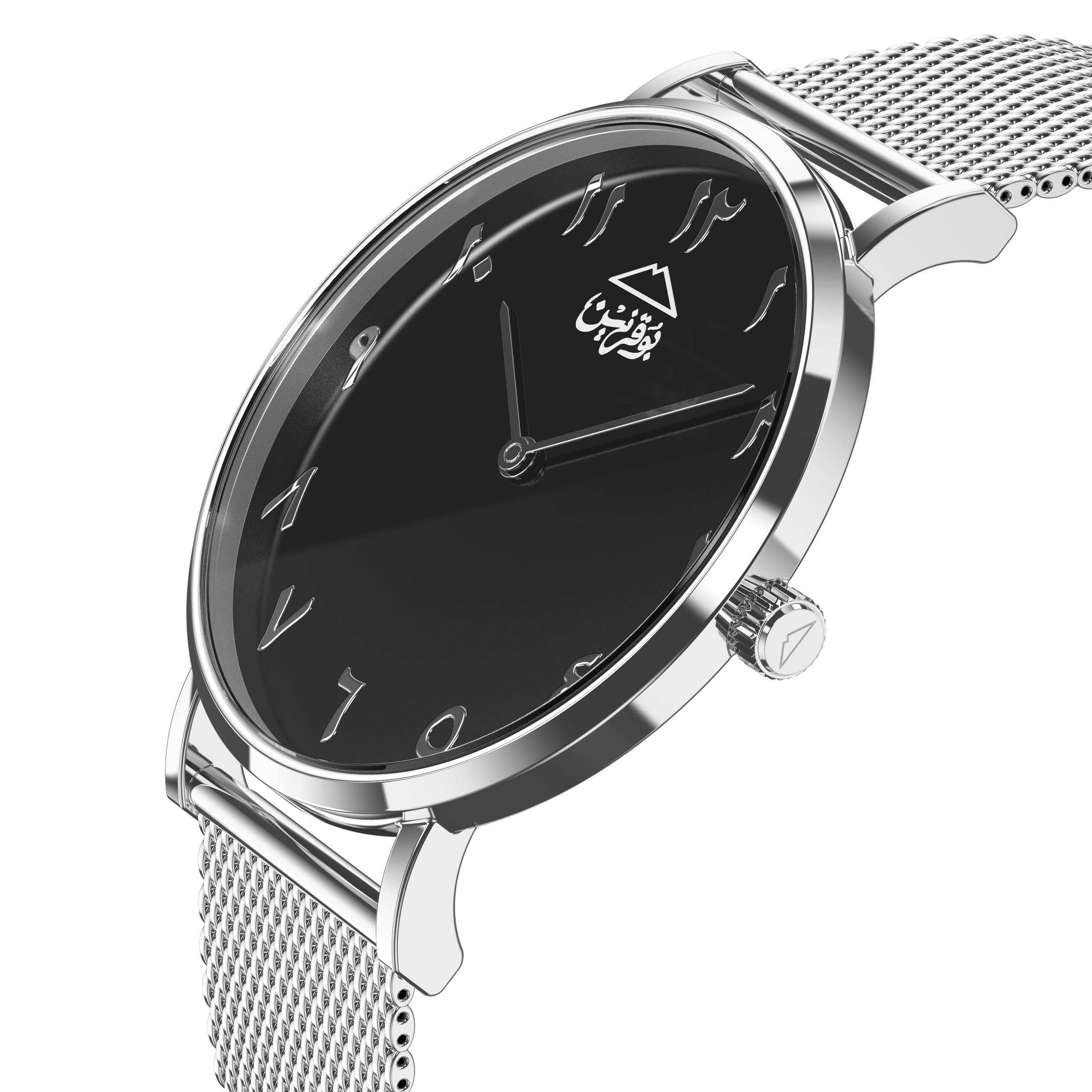 • Cadran avec Calligraphie Arabe : Un cadran noir distinctif orné de chiffres indiens et d'un logo en calligraphie arabe, ajoutant une touche de sophistication et de style unique, symbolisant la fusion culturelle et l'héritage artisanal.