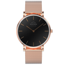 La montre est délicatement plaquée en or rose, donnant à cette pièce une élégance douce et raffinée. Le bracelet milanais apporte une touche de luxe naturel et une sensation de confort indéniable.